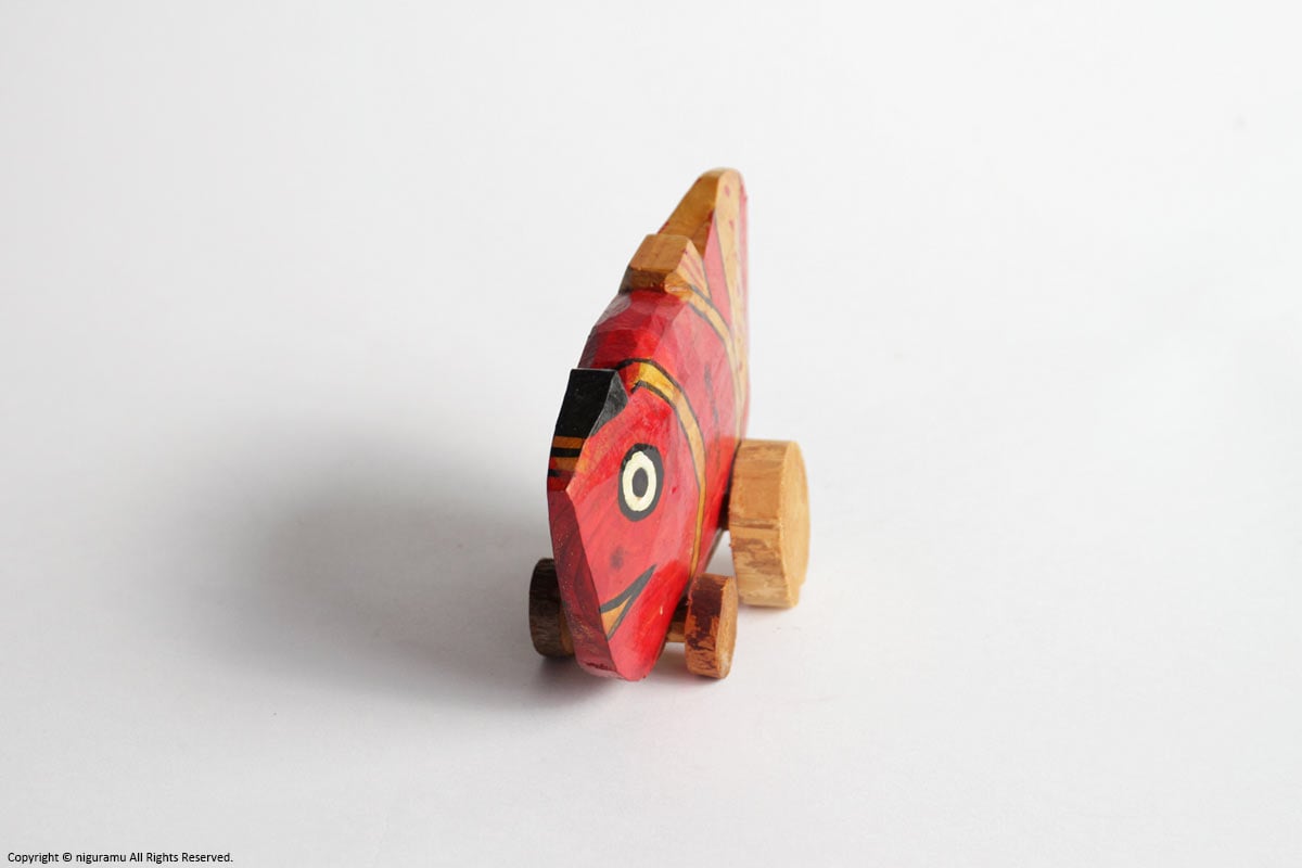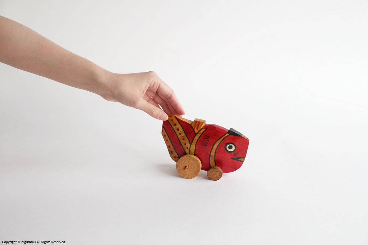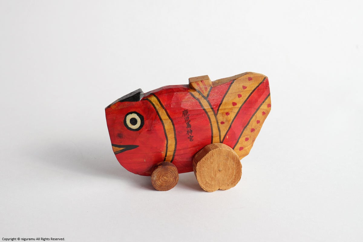 釣針を呑みこんだ赤女魚を模したもので、旧3月10日尊が綿津見国より御帰還遊された佳日を偲ぶ藤祭当日社頭でひさぐ由緒深い玩具です。