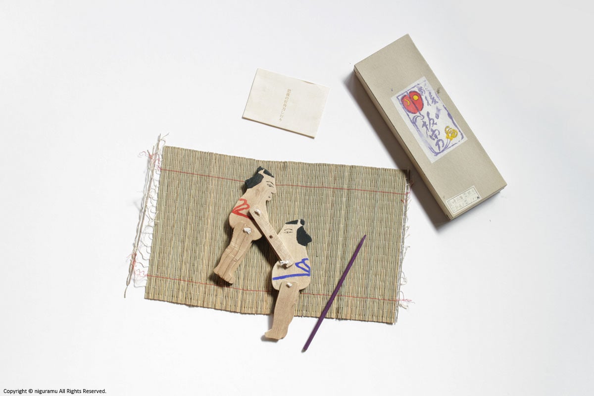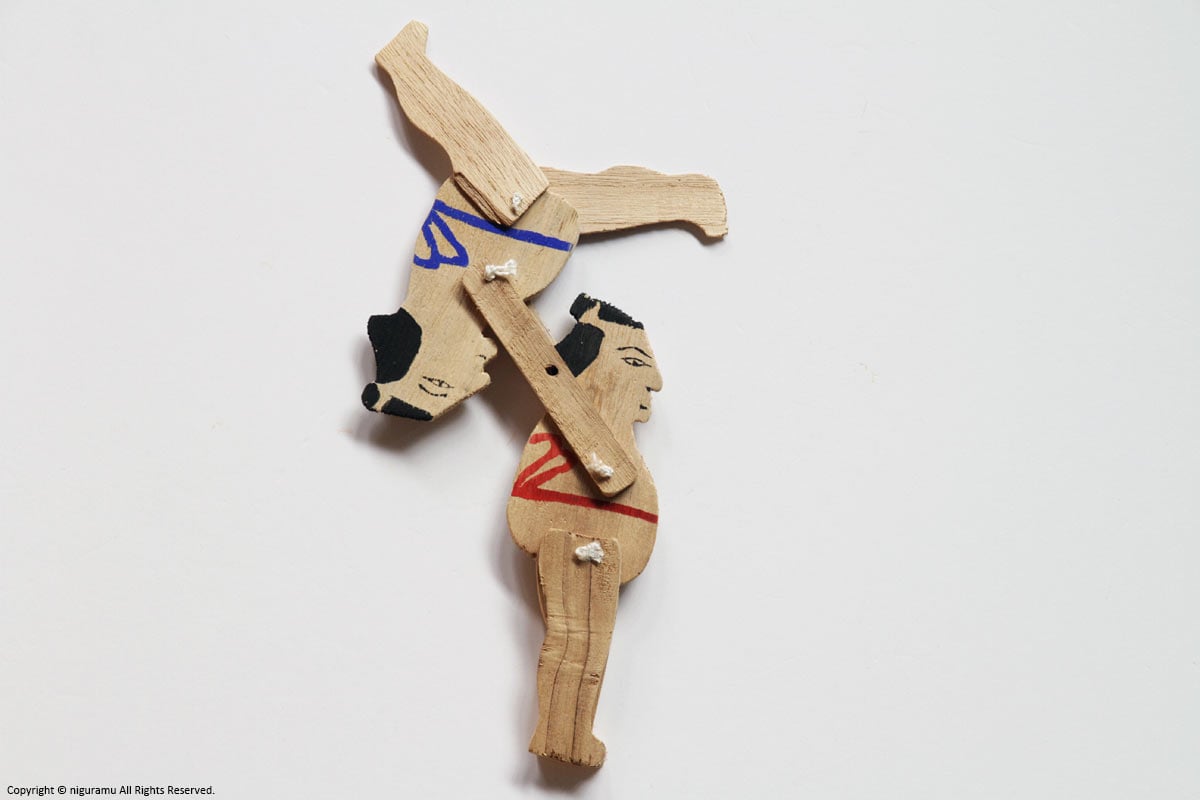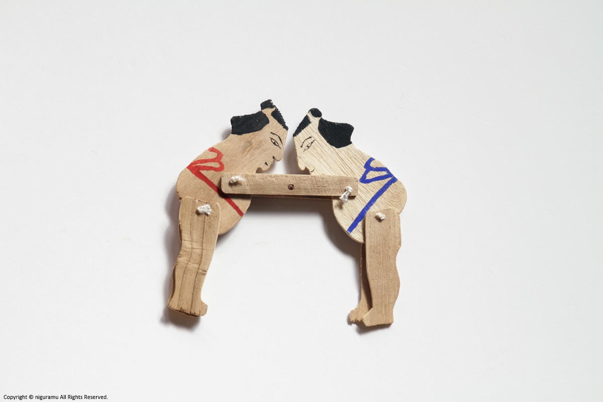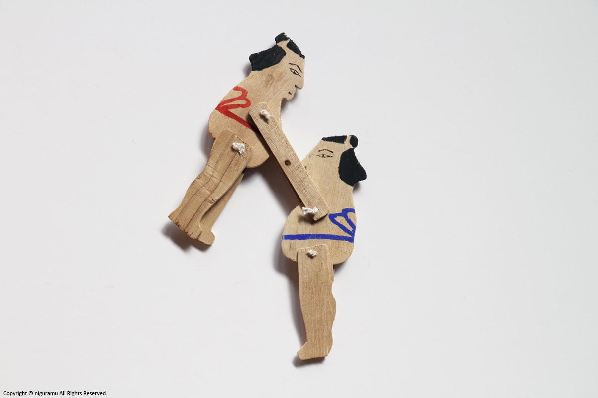 素朴な荒削りの板にショッキリ角力にも似たユーモラスな動く郷土玩具としてこの板角力は今もなお日本に広くその名を残している。