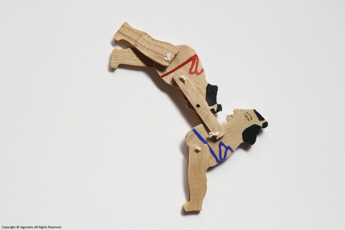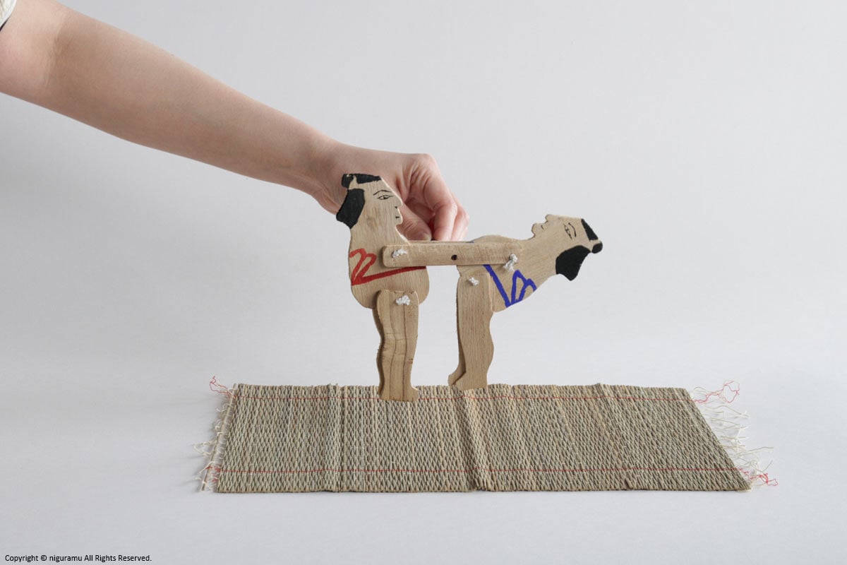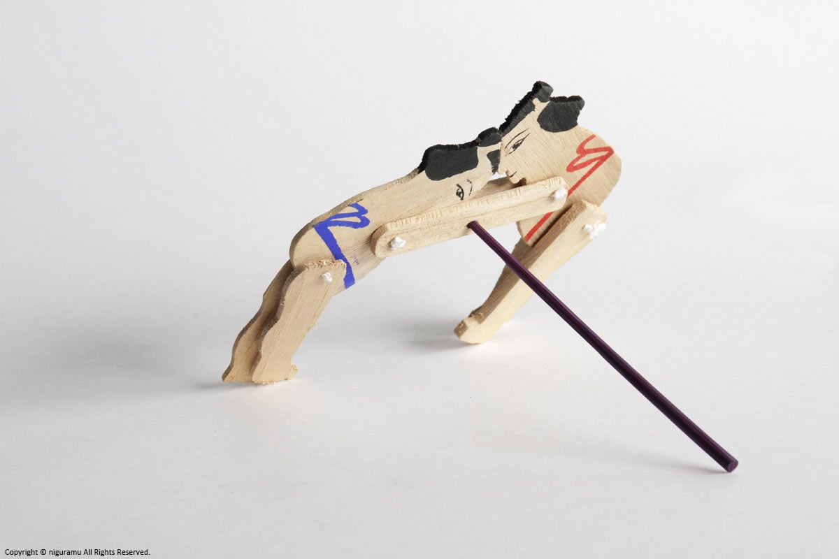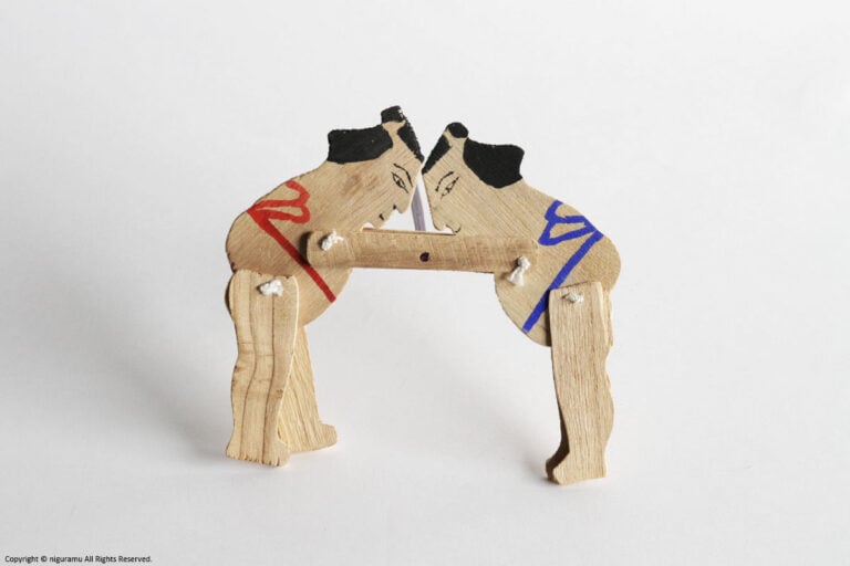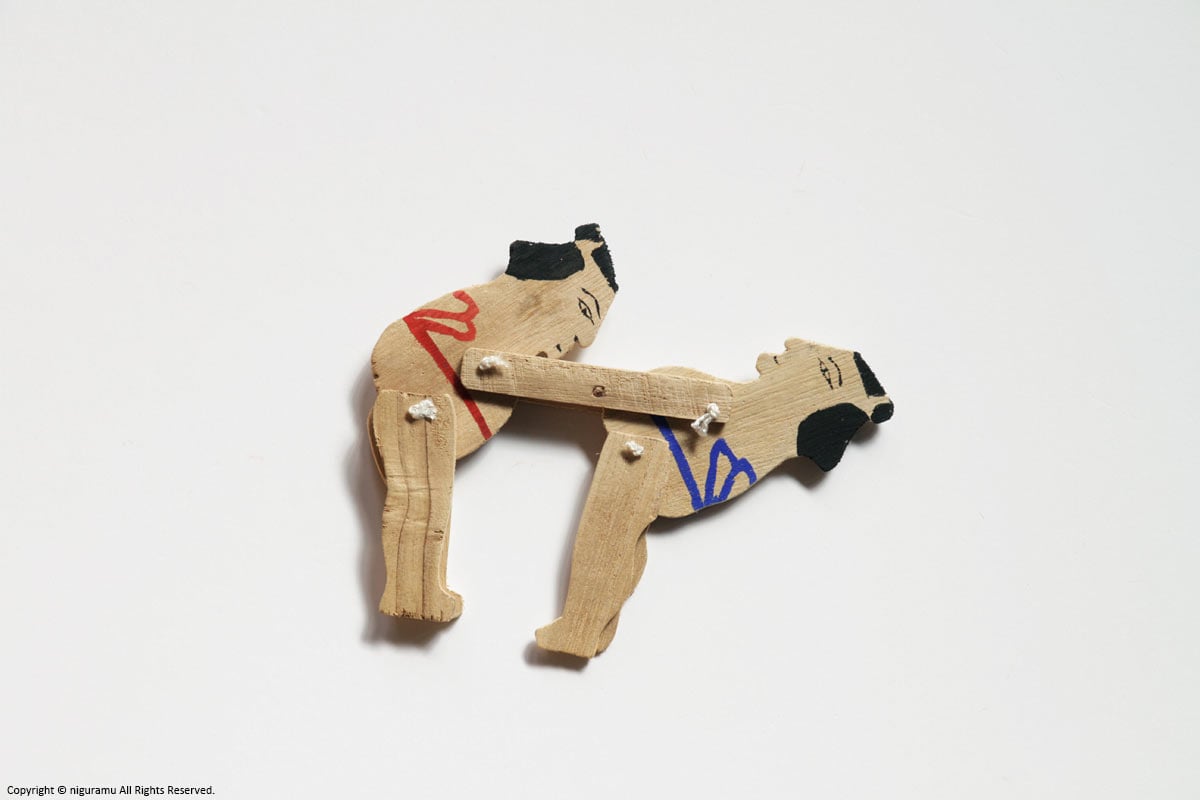 素朴な荒削りの板にショッキリ角力にも似たユーモラスな動く郷土玩具としてこの板角力は今もなお日本に広くその名を残している。