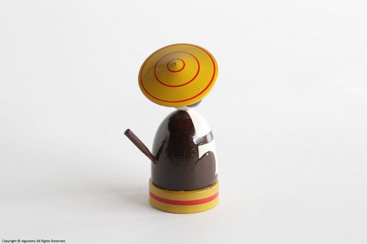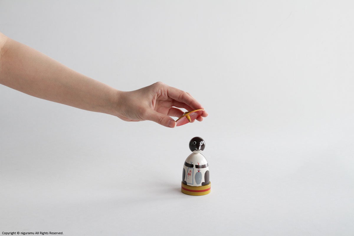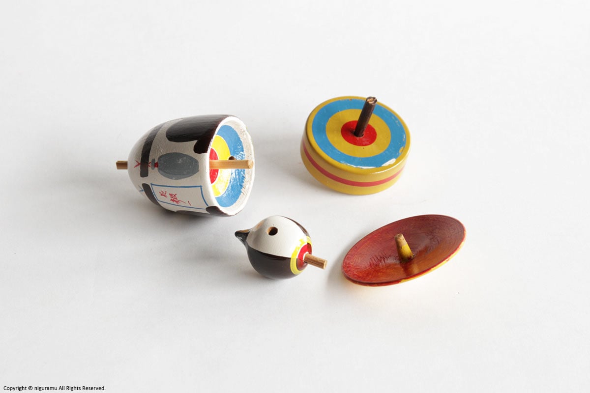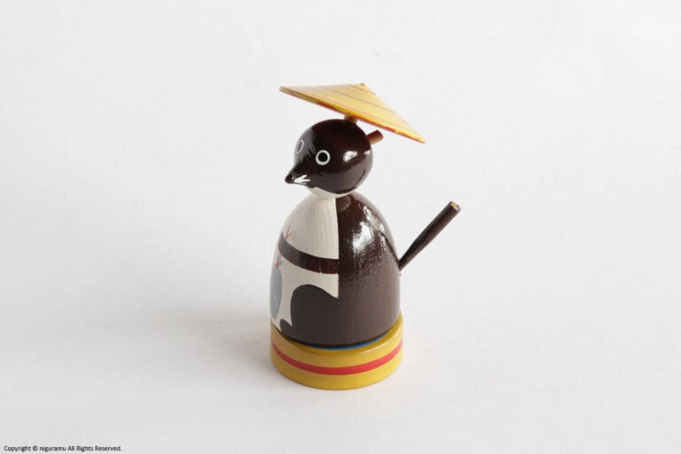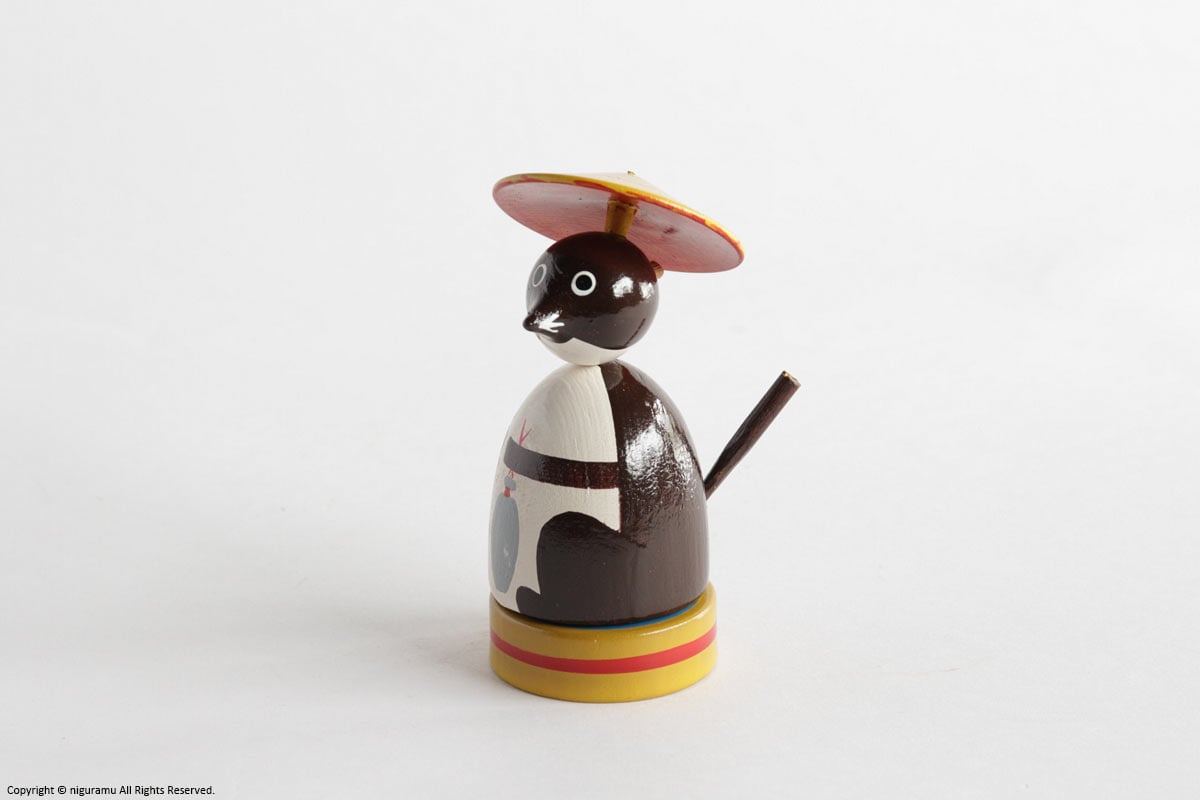 桜の木を切り時間をかけて乾燥させた物を材料とし、ろくろで削られ、塗られと、ここまではその他のコマの作りの技法に共通するものですが、彦一こまは、遊ばないときはたぬきの置物として飾れるのが特徴です。